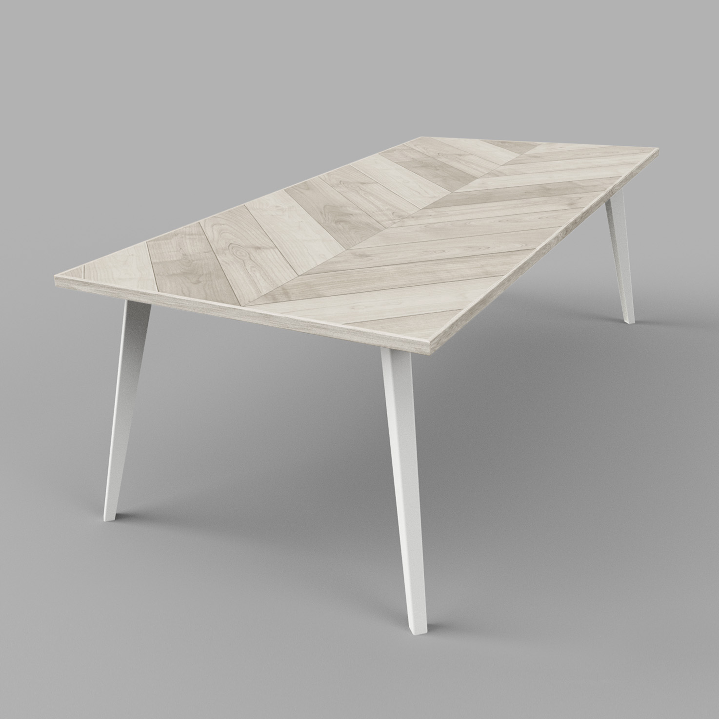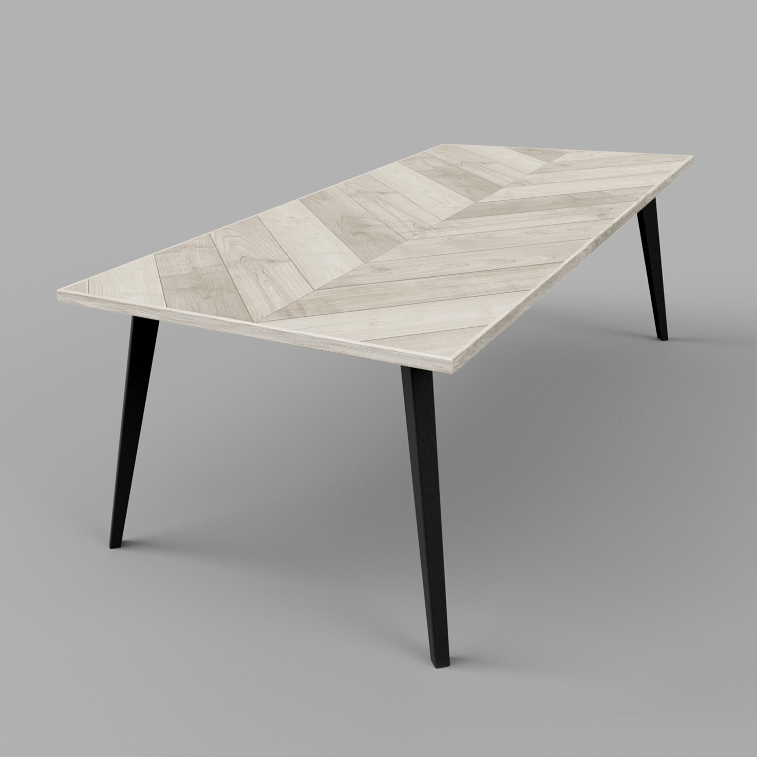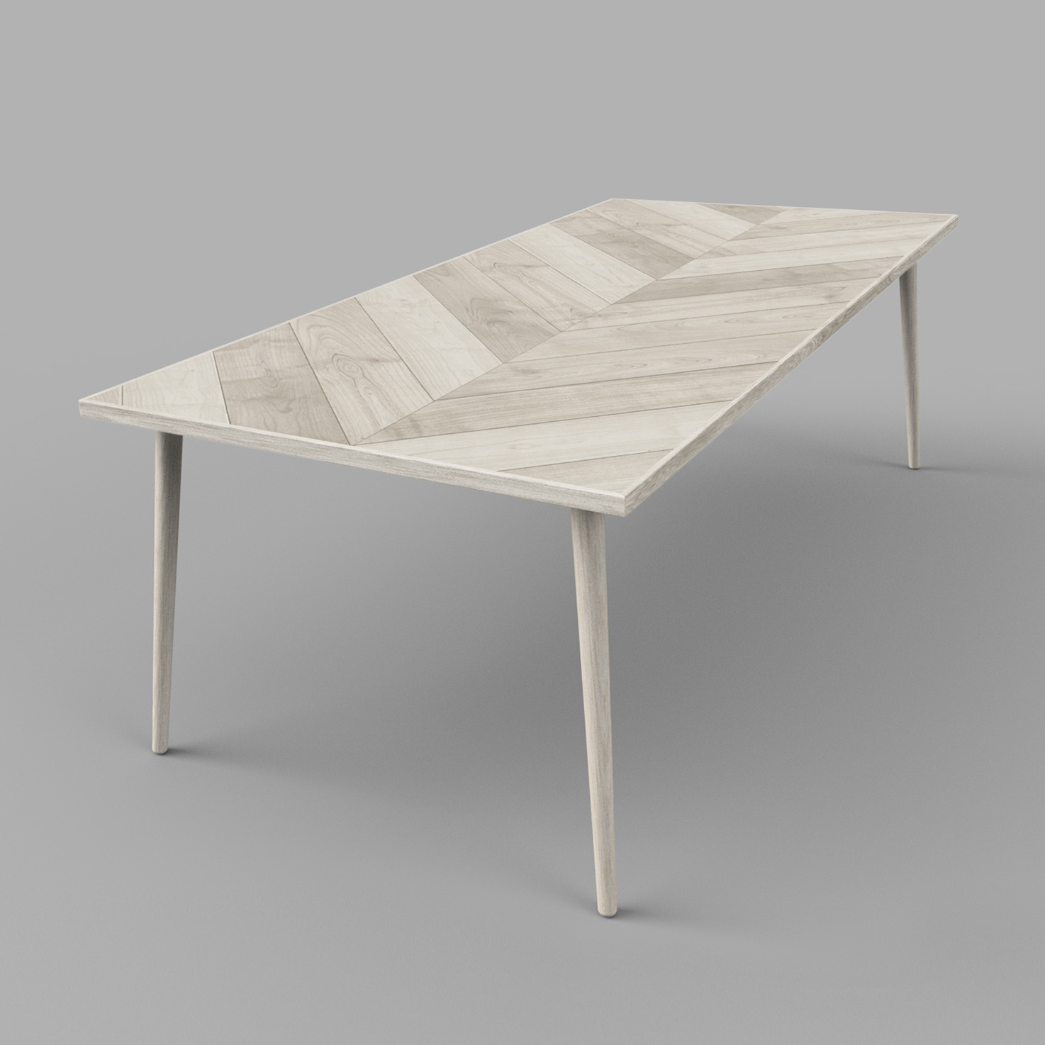 Unikt håndlavet spisebord i egetræ lagt i “pile” mønster.