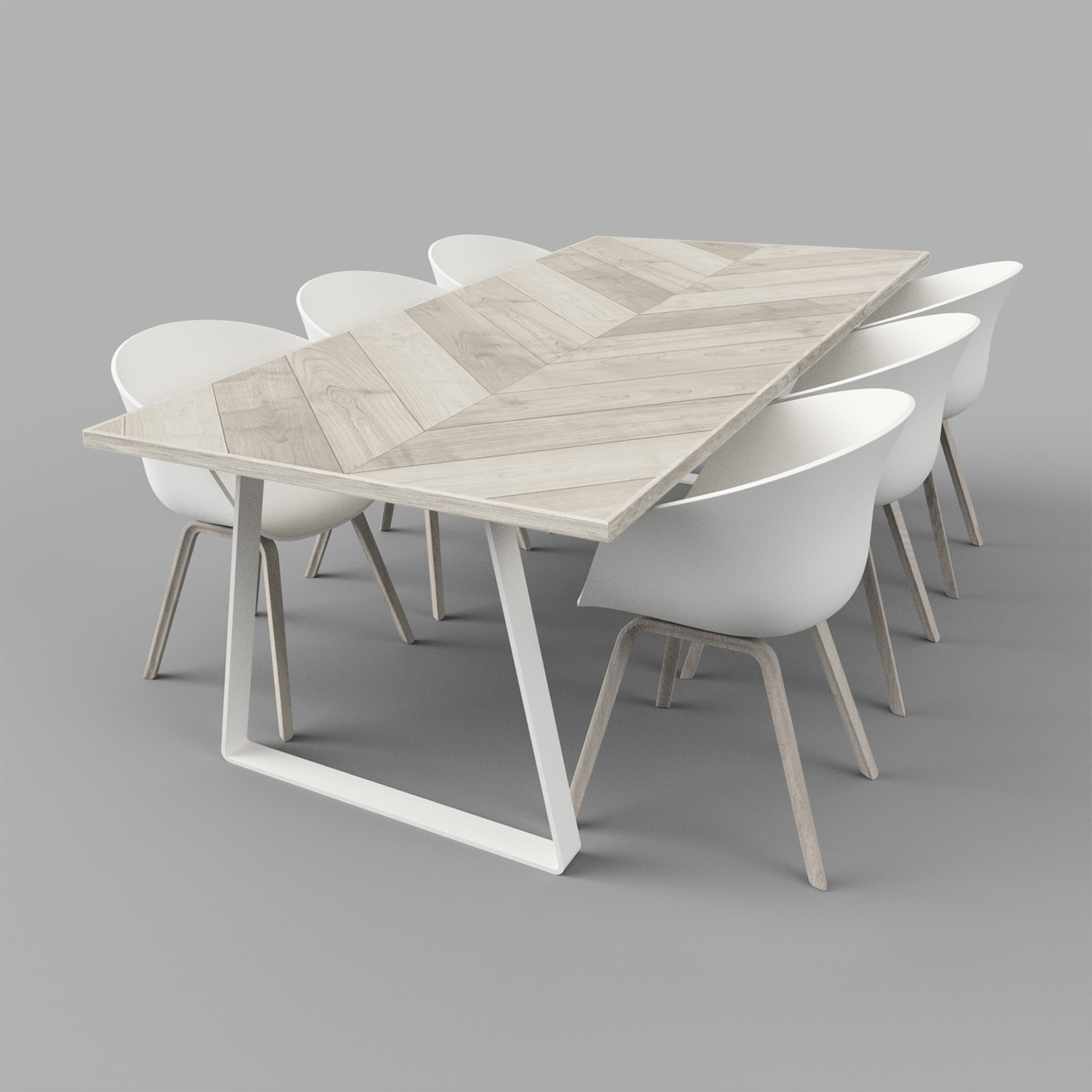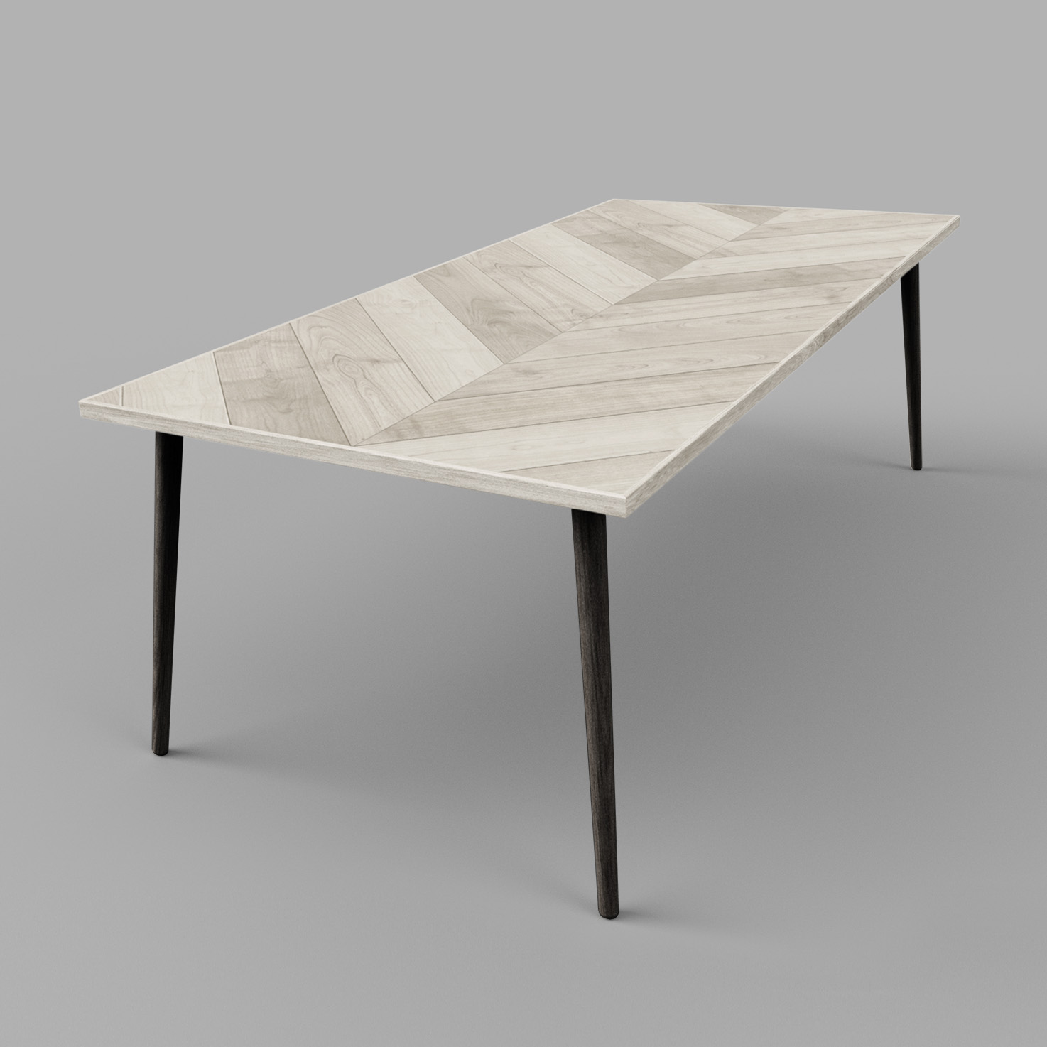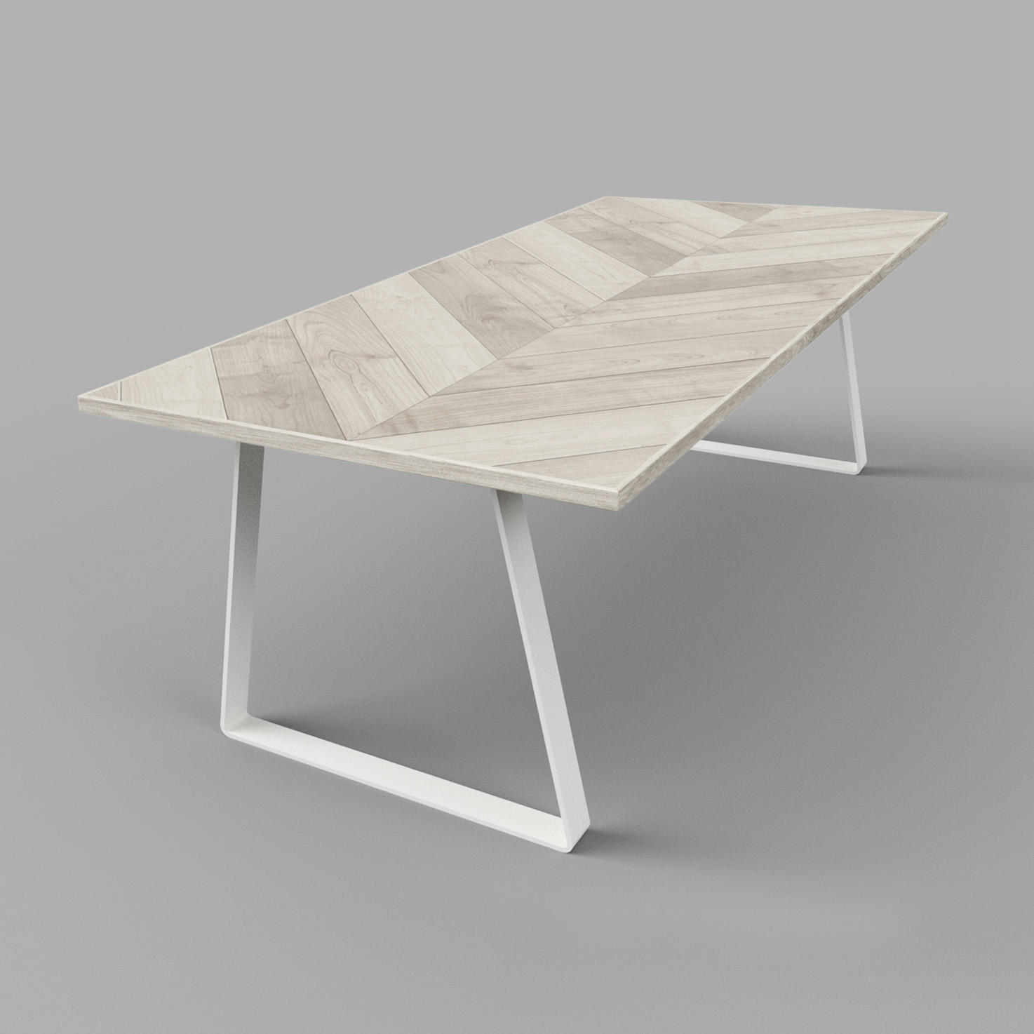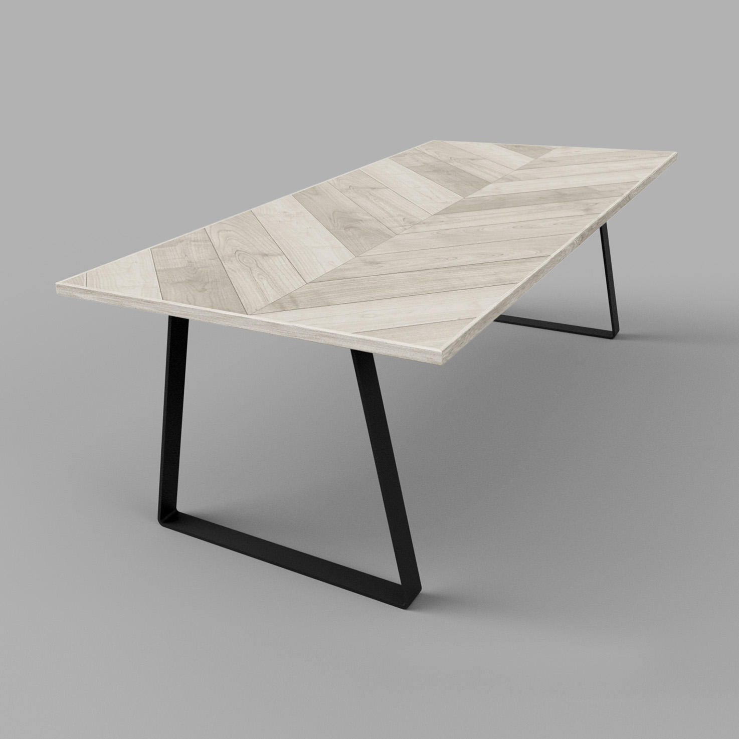 Unikt håndlavet spisebord i egetræ lagt i “pile” mønster.