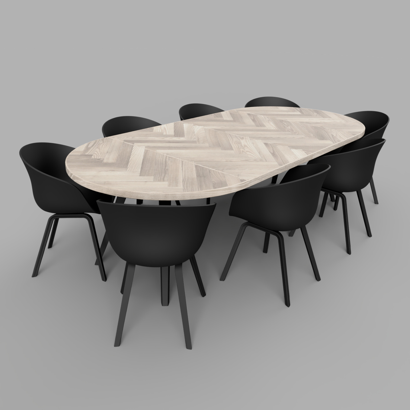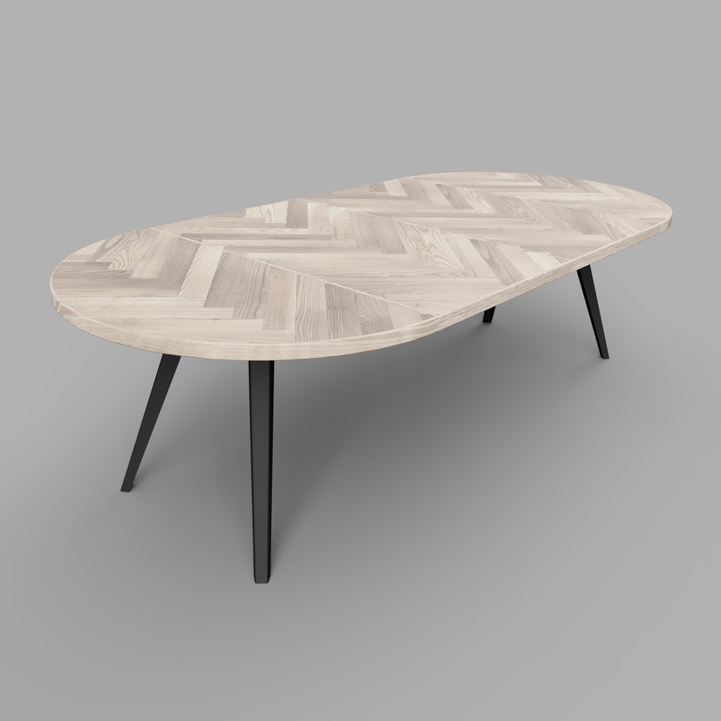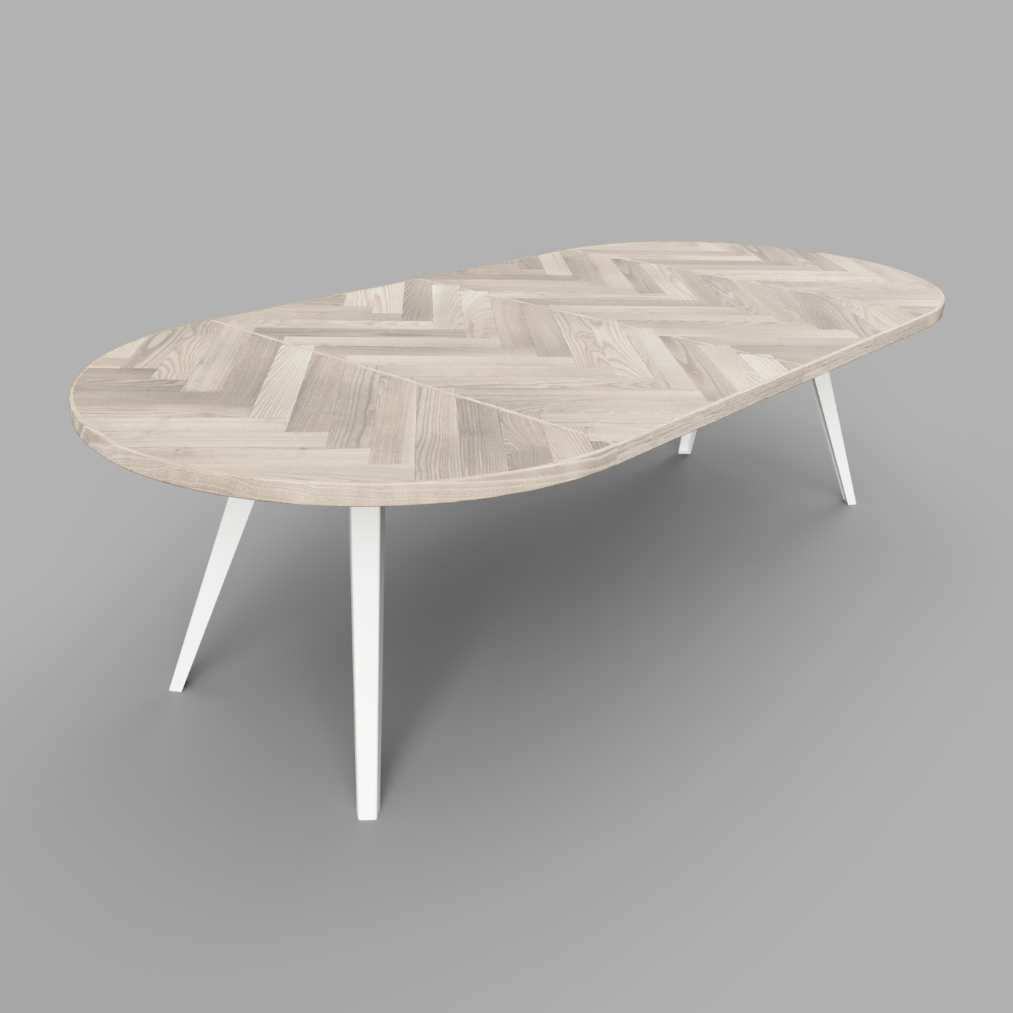 Unikt håndlavet spisebord i egetræ lagt i sildebensmønster.