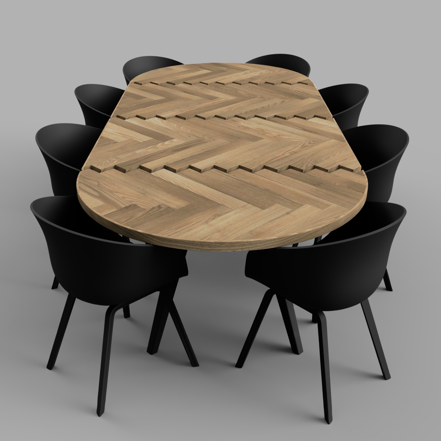 Unikt håndlavet spisebord i egetræ lagt i sildebensmønster.