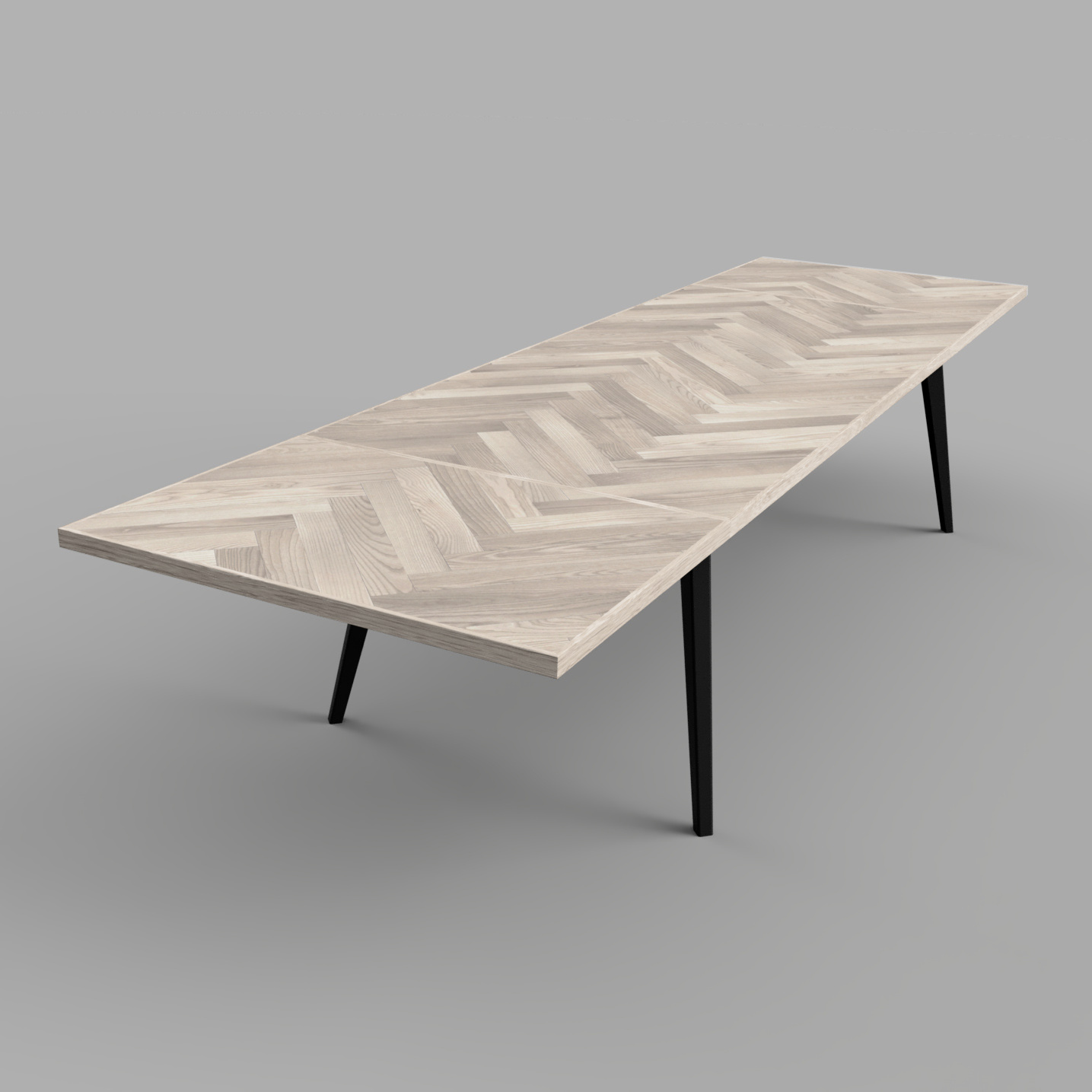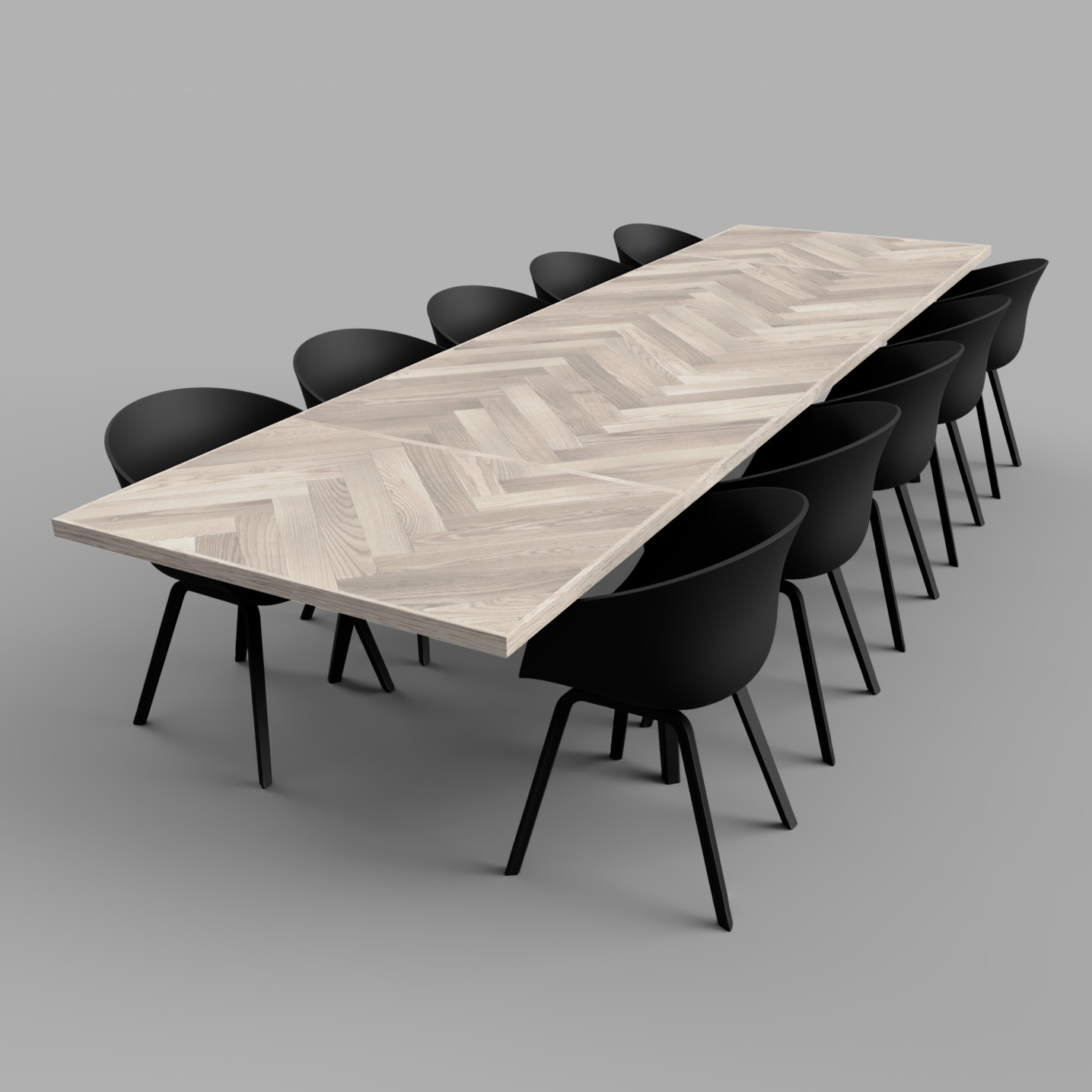 Unikt håndlavet spisebord i egetræ lagt i sildebensmønster.