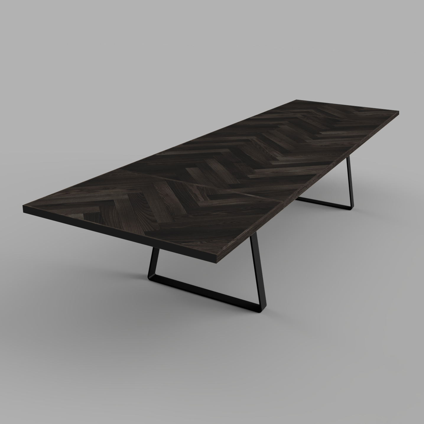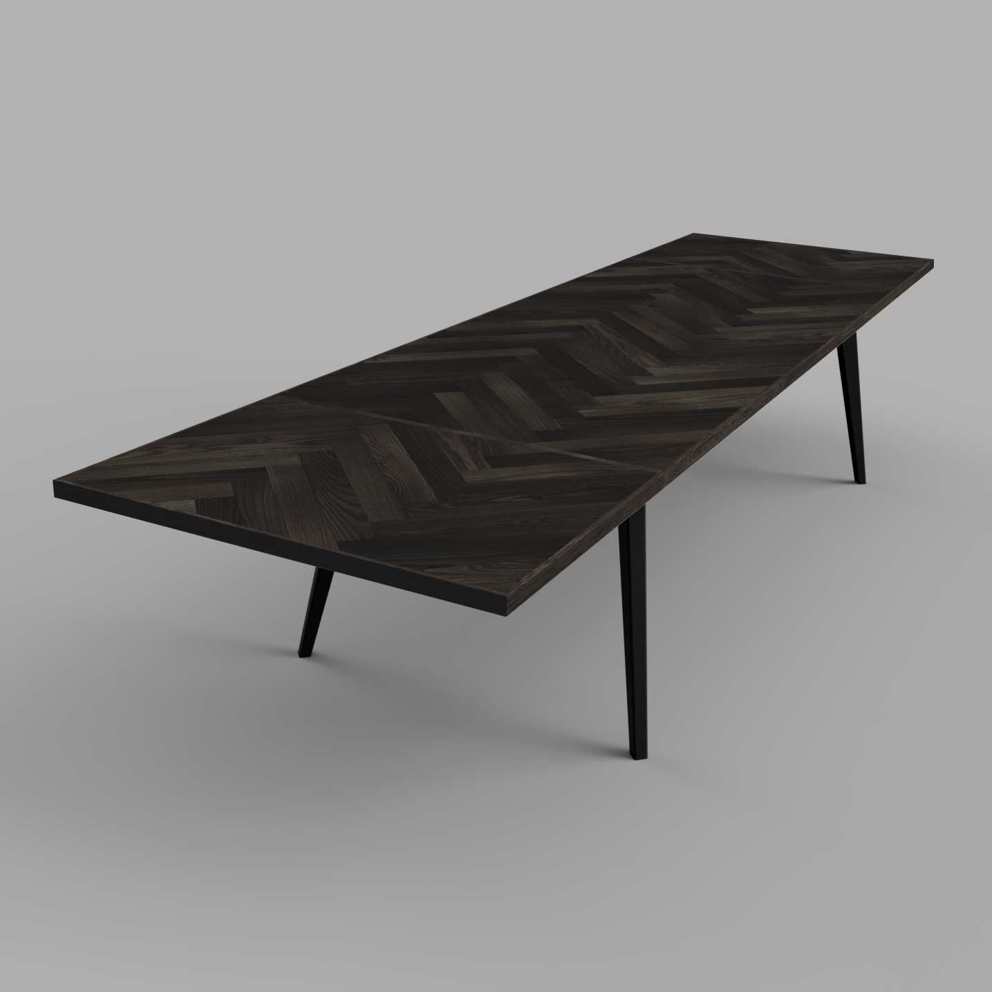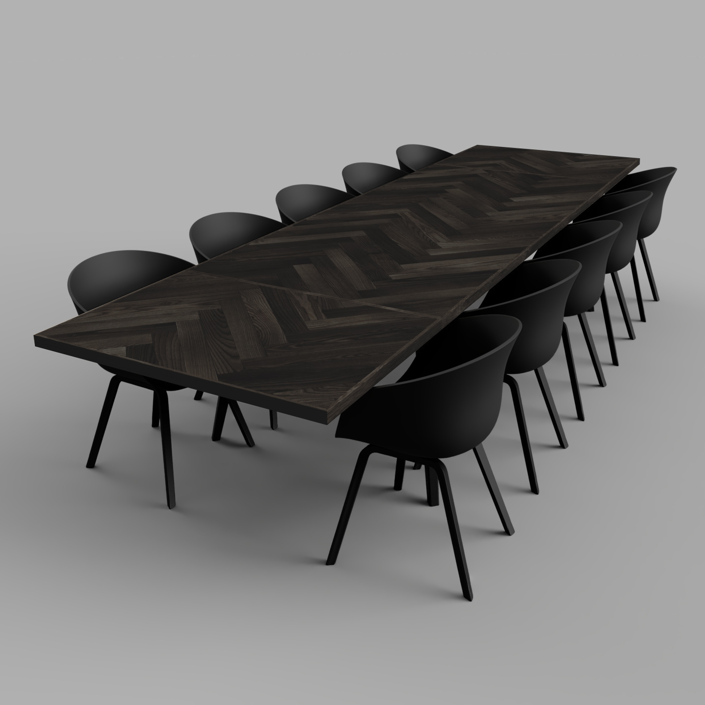 Unikt håndlavet spisebord i egetræ lagt i sildebensmønster.