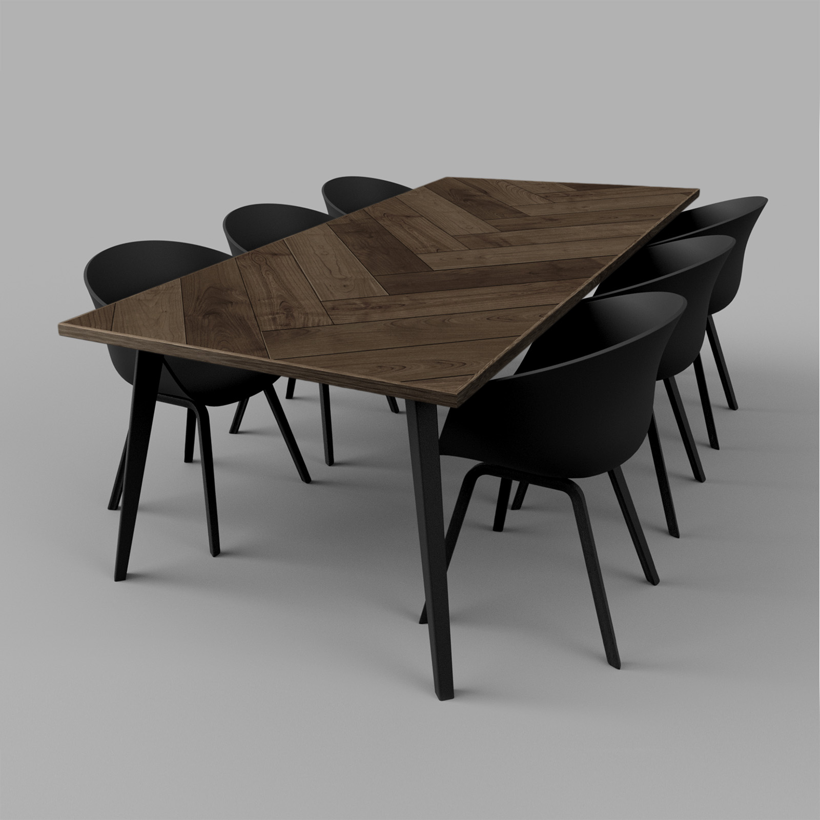 Unikt håndlavet spisebord i egetræ lagt i sildebensmønster.